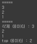 class StackWithList : # 생성자(스택, top의 인덱스 번호 초기화) def __init__(self) : self.stack = [] #빈리스트 self.top_idx = None # 스택이 비어있는지 확인 def is_empty(self) : return len(self.stack) == 0 # 확인 출력용 메소드 def show(self) : for i in self.stack[::-1] : #스택은 나중에 들어온 것부터 나간다 => 역순으로 출력 print(i) # 데이터 삽입 def push(self, data) : self.stack.append(data) if len(self.stack) == 1 : self.top_idx = 0 #top의 인덱스 번호 0 else : self.top_idx += 1 # 데이터 삭제 def pop(self) : if self.is_empty() : raise IndexError("빈 스택입니다") data = self.stack[self.top_idx] #top의 요소를 data 변수에 저장 del self.stack[self.top_idx] self.top_idx -= 1 return data # top요소 확인 def peek(self) : return self.stack[self.top_idx]stack = StackWithList() # push() : 스택에 데이터 추가 stack.push(1) stack.push(2) stack.push(3) print("=====") stack.show() # pop() : 스택의 데이터 삭제 print('=====') print(f"삭제 데이터 : {stack.pop()}") stack.show() # peek() : top요소 확인 print(f"top 데이터 : {stack.peek()}")